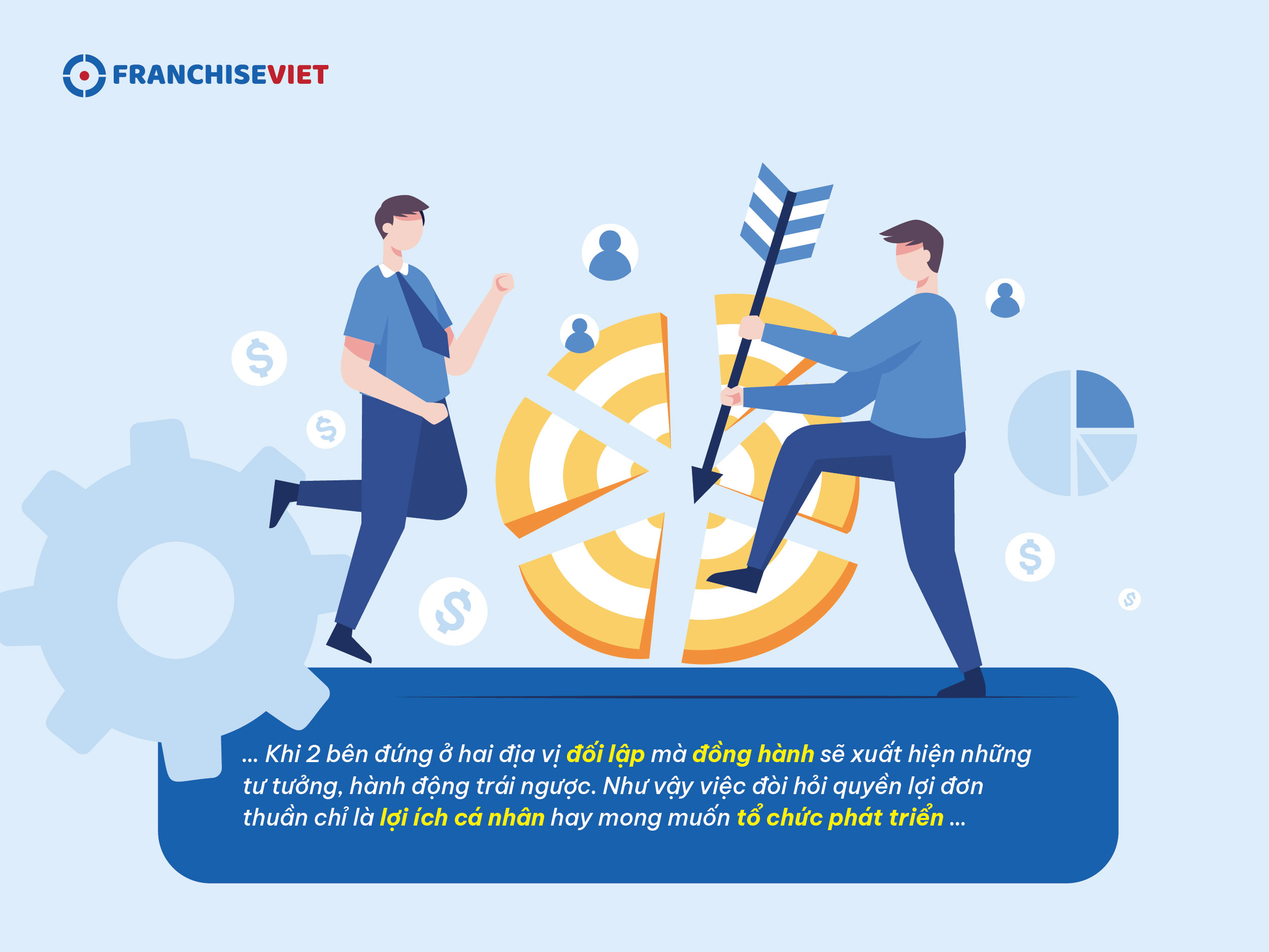 Mỗi một con người khi đứng ở địa vị nào, nhất định sẽ có những suy nghĩ riêng biệt, đứng ở những địa vị giống nhau sẽ có những tâm tư và tư tưởng tương đối giống nhau. Khi 2 bên đứng ở hai địa vị đối lập mà đồng hành sẽ xuất hiện những tư tưởng, hành động đối lập như vậy. Có đấu tranh, có đòi hỏi quyền lợi thì tổ chức đó mới phát triển. Nếu trên tinh thần đổi mới thì hệ thống nhượng quyền sẽ rất vững mạnh, nhưng trên tinh thần phản động, phá hoại thì những đấu tranh đó, đòi hỏi quyền lợi đơn thuần chỉ là lợi ích cá nhân, chứ không hề hướng tới lợi ích cộng đồng nhượng quyền. Không riêng gì hệ thống nhượng quyền, mà trong tất cả các tổ chức, mâu thuẫn giữa các vị trí đối lập luôn tồn tại. Tuy nhiên, bản chất của hệ thống nhượng quyền là chia sẻ quyền lực lớn tới các chủ cơ sở, cho nên sự đấu tranh tư tưởng và đòi hỏi cũng lớn hơn.
